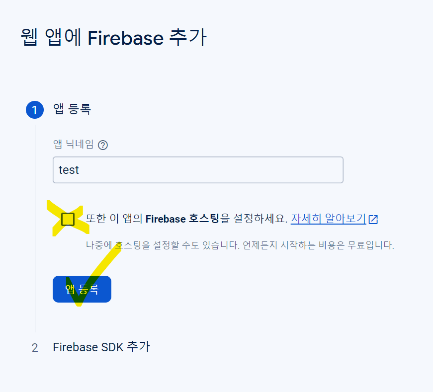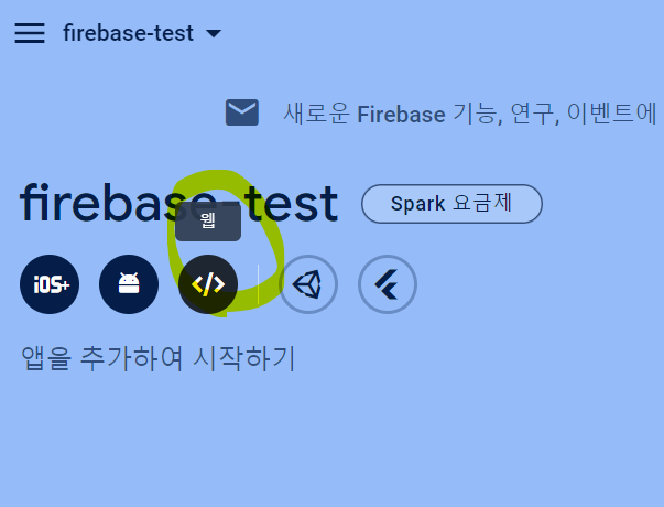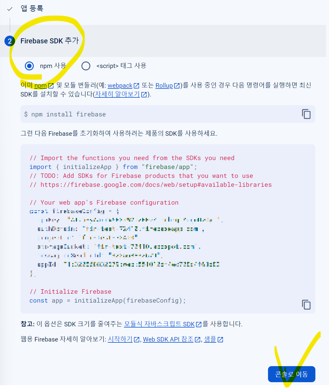 3. </> : 웹 클릭 - 앱 등록 (호스팅은 미체크 : 다른거 쓸 예정) - npm 사용 클릭 후 콘솔로 이동